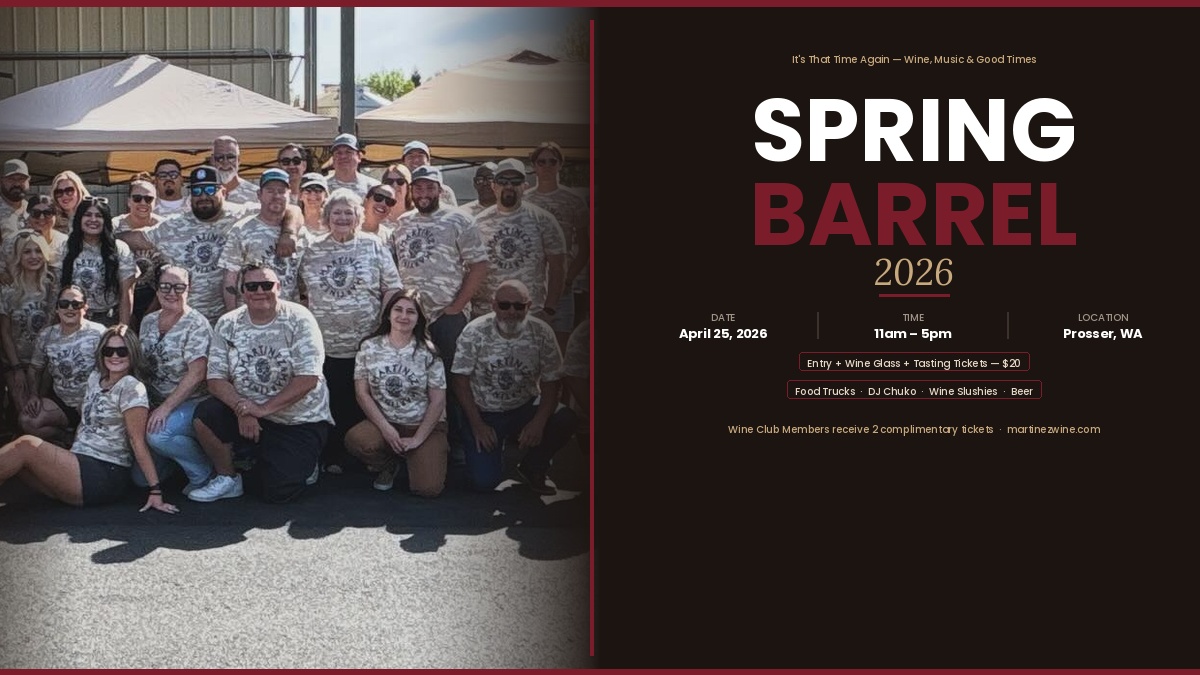 Martinez & Martinez Winery invites you to Spring Barrel 2026 — our favorite day of the year. Come spend a spring afternoon at the winery in Prosser with great wine, great food, great music, and the people who make it all happen. Your $20 ticket gets you entry, a keepsake wine glass, and four tasting […]